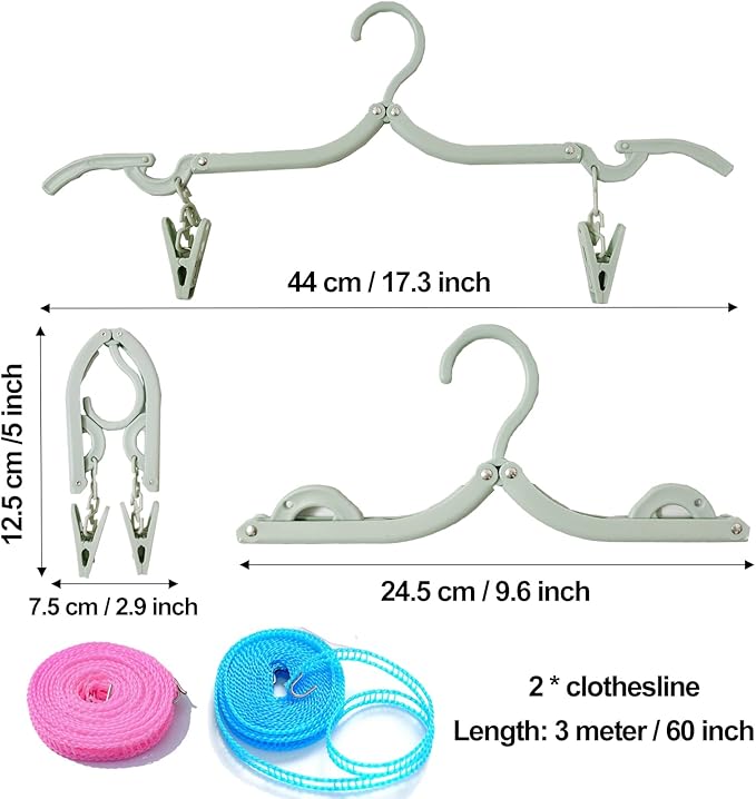 Package Includes: You will receive 24 PCS travel clothes hangers with clips in 4 colors, blue, pink, green and yellow, 6 of each color. The travel Hangers set also includes 2 clotheslines, one pink and one blue. Meet all your outdoor needs